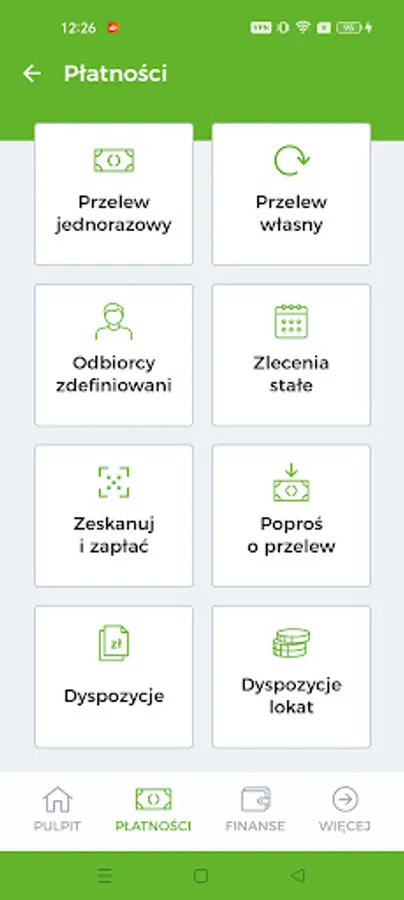 - Transfers - you can quickly and conveniently make a one-off external transfer, own internal transfer, to a defined recipient, as well as a standing order. You can also make the transfer again and make a return transfer to the sender, as well as download confirmation of the transfer in pdf format or send the confirmation via applications available on your mobile device. You will confirm the ordered instructions with your PIN code. There are also Google Pay payment options, a transfer based on a scanned QR code and sending a transfer request to another person.
