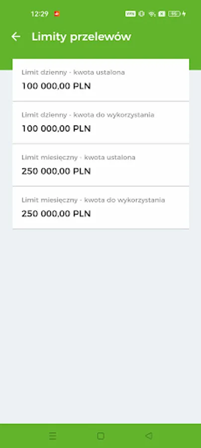 - Cards – you will get information about all cards issued to the current account and about the total monthly limit granted to all cards issued to the account and all limits granted to a given card. You can also enable/disable contactless and online payments, block a card and activate a new card.