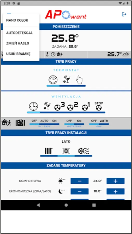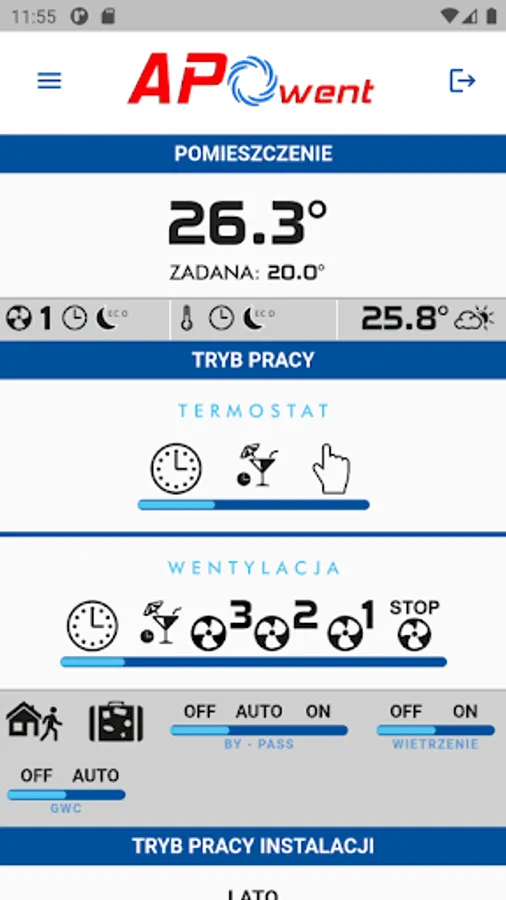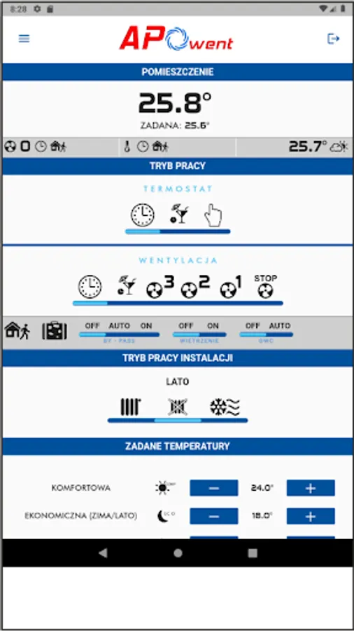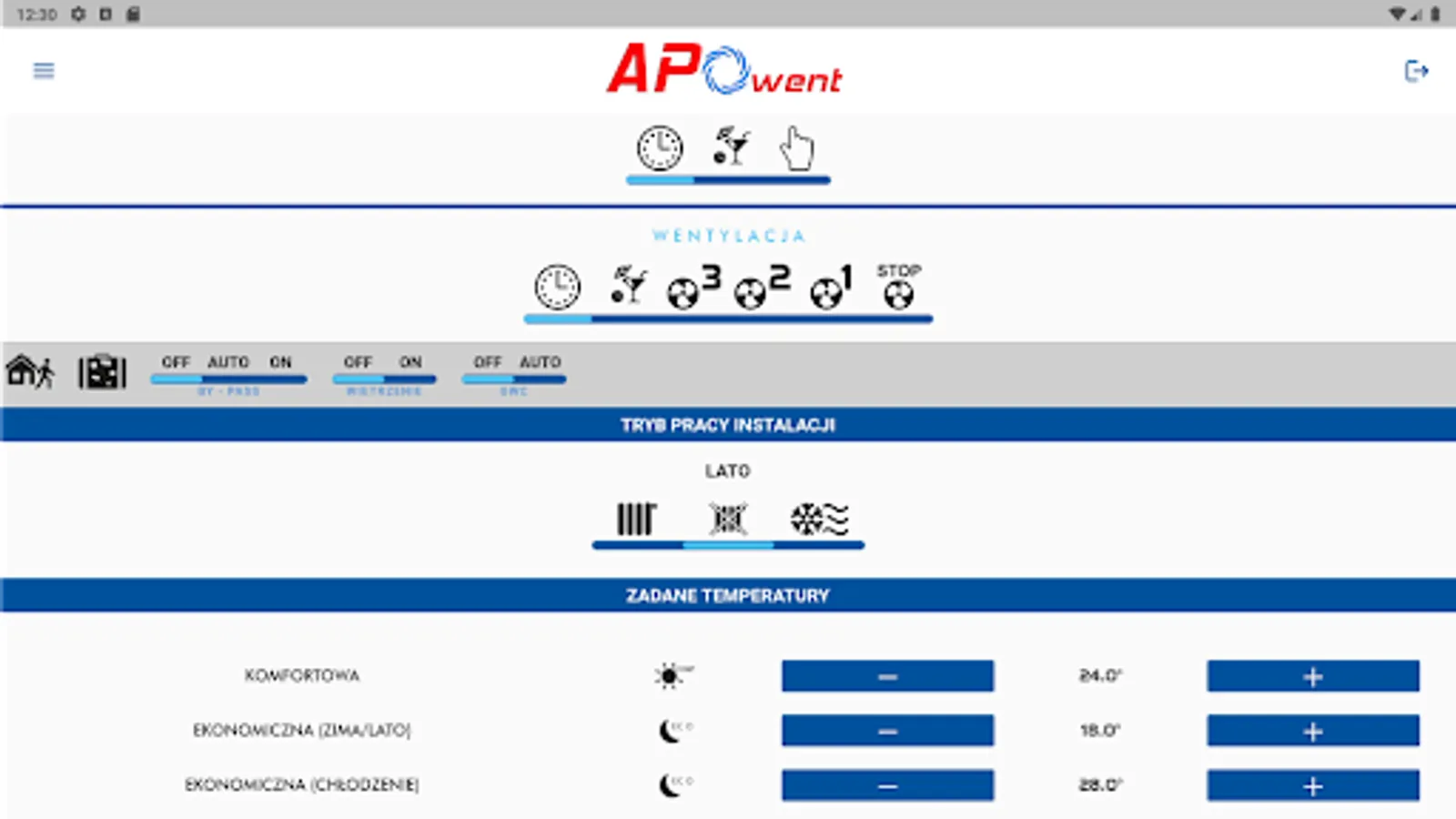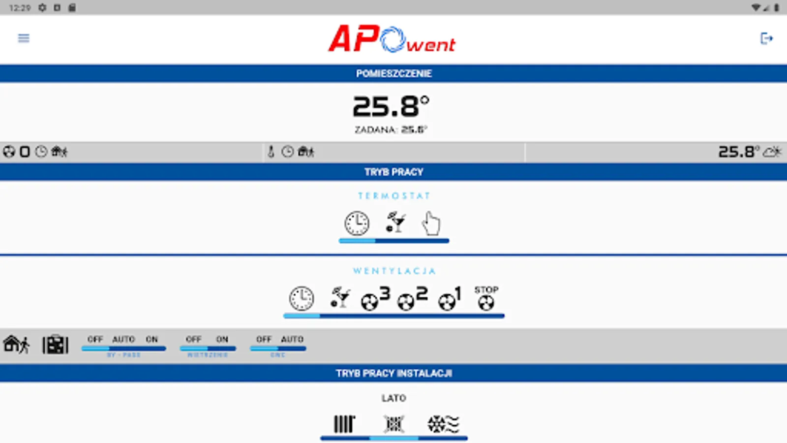 The application allows you to remotely control the air handling unit and read measurements, change temperature settings and the work schedule