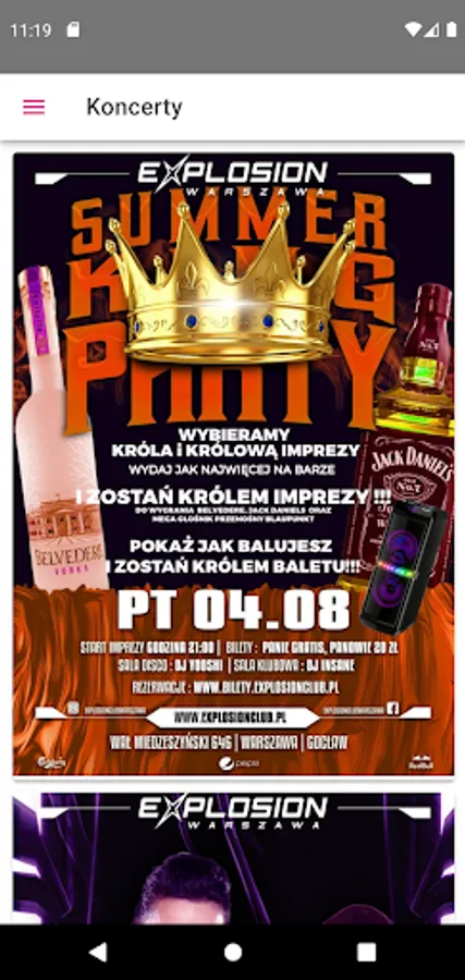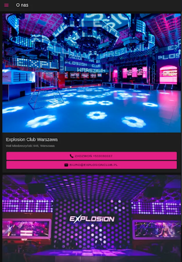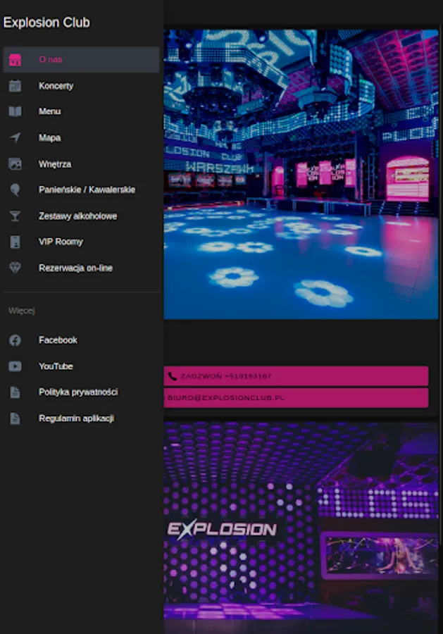 Explosion is a modern club with a unique design. The club has a large dance hall - here you will hear the greatest hits and the latest hits of Polish disco polo and dance music. The club has a large stage where concerts of Polish and foreign bands are organized. The second room is a room behind the stage with club music, and the third is a room on the mezzanine.