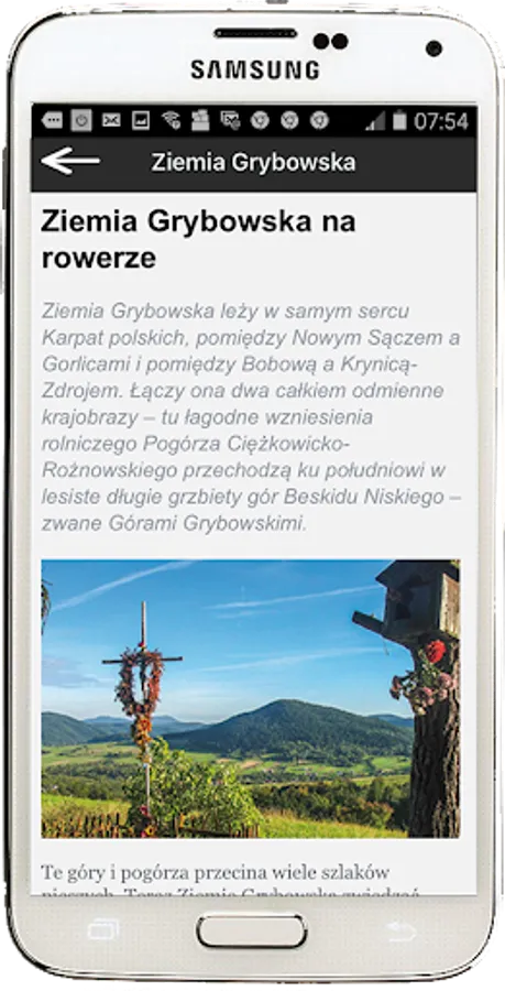 The application presents concise information about conduction passing point, signaled sound and vibration. Complementing the trail guide is a brief introduction about the cultural and natural heritage Ziemi Grybowskiej.