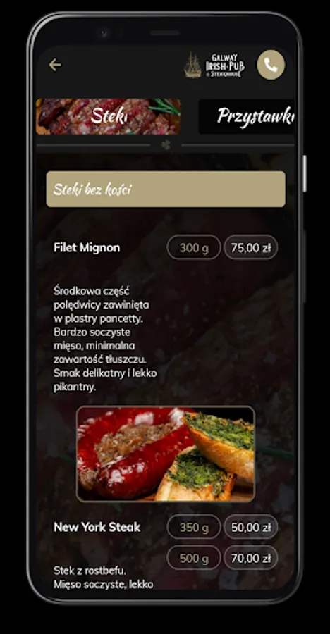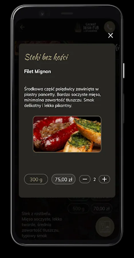Irish Pub & Steakhouse is a cult gastronomic place in Rzeszów, operating since 2002. The application presents the current menu of the premises. You're welcome.