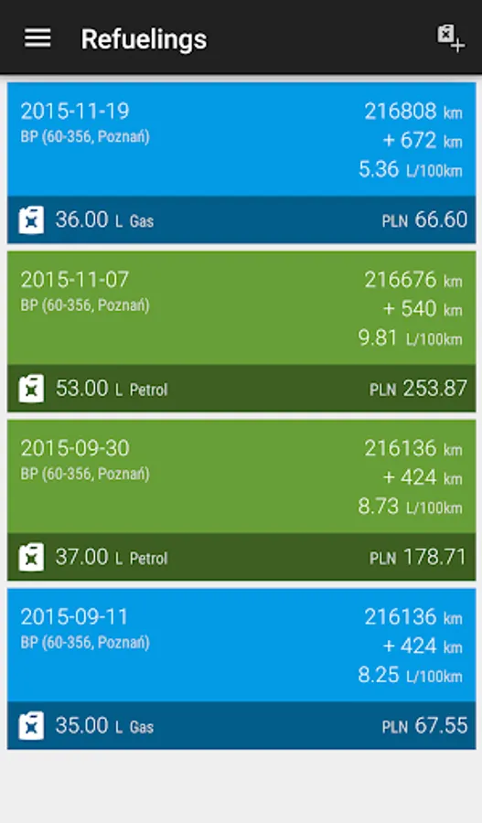 The application helps you manage your vehicles, you can add information about refuellings to then display statistics and graphs of fuel consumption. You can also configure notifications about events, such as: technical inspection, oil changes, insurance, timing belt replacement, replacement filters, replacement of brake discs and pads and many more. The application will remind you at a specified time or when you pass a specified distance.