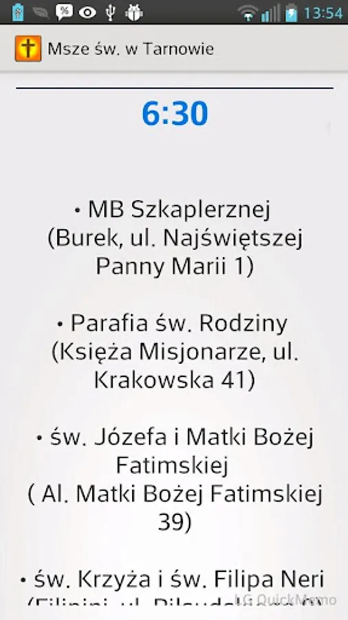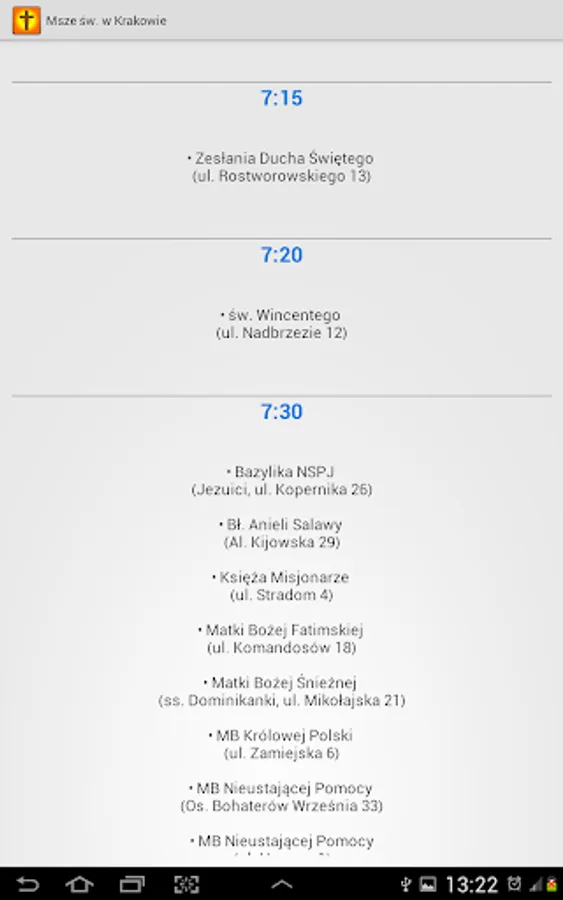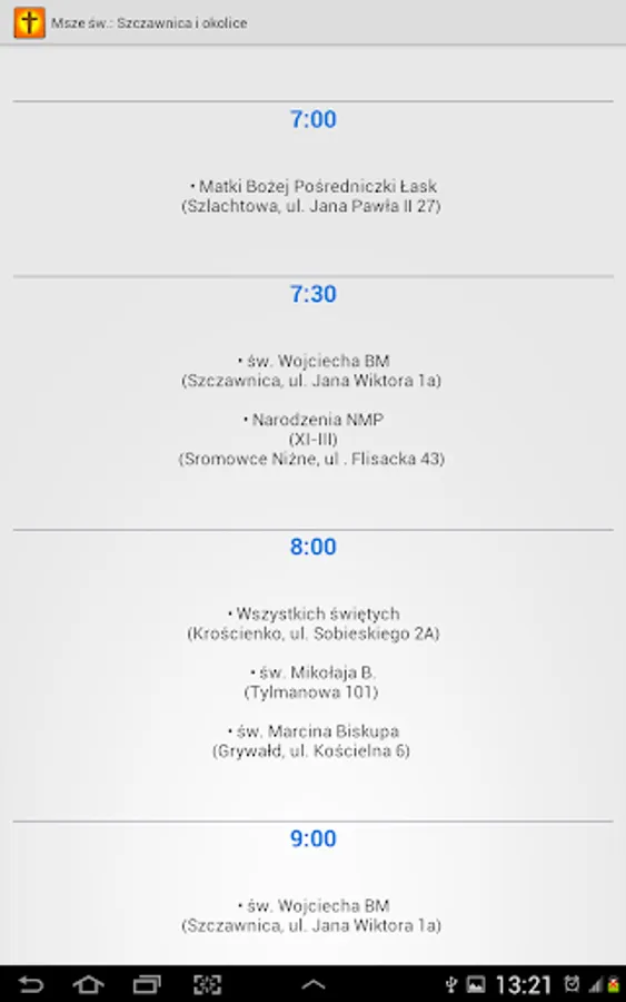 The application is based on data parish, located on the websites of the diocese. Unfortunately, these data are often not updated on a regular basis when it comes to Mass on Sunday, especially in terms of changes in start times in the summer months.