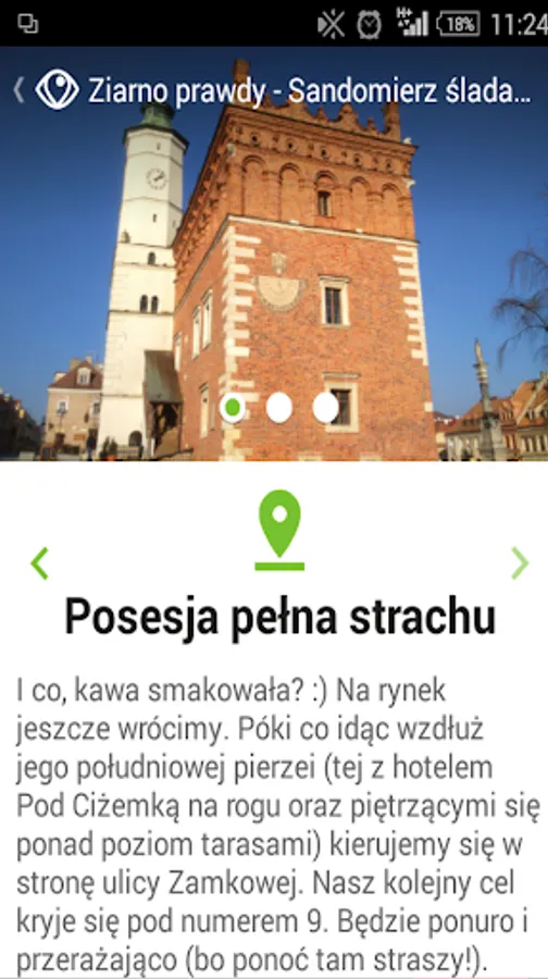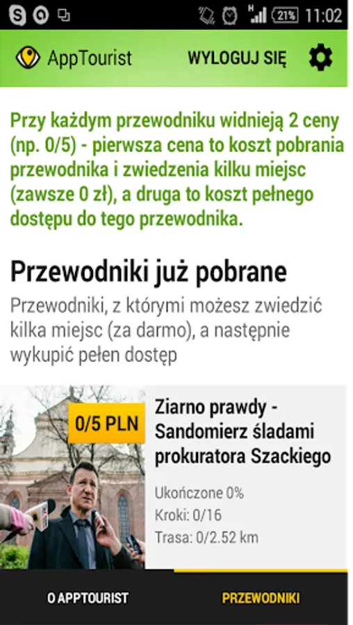 AppTourist is a free mobile application which consists of many guides. Each guide consists of many steps, and the step is a description of the route you are following and sites, which can (but need not) on the way to visit. By downloading the guide you have access only to the introduction and first step. To discover the next step you need to "check in" at certain of our place, for example. The entrance to the cathedral, the monument or the market. This way you will get tips on how to get to the next place. If we add that along the way you will visit places in which frequented the hero of your favorite book, story or urban legend that the more it gets interesting, is not it? :)