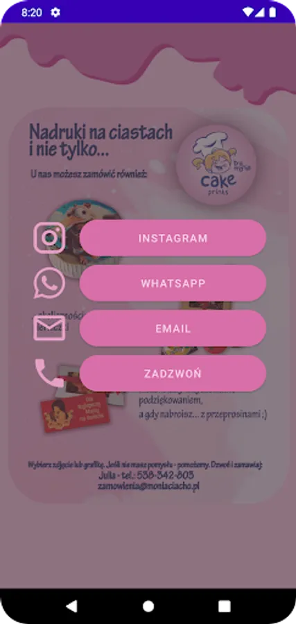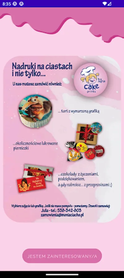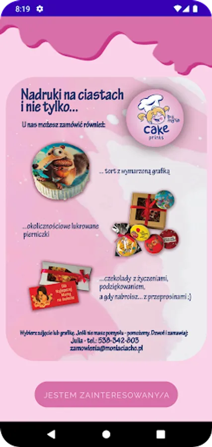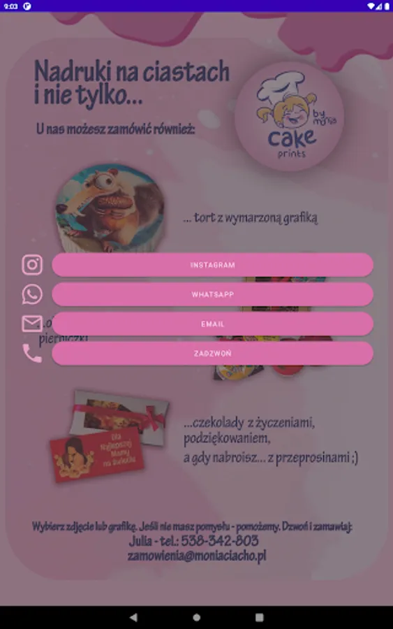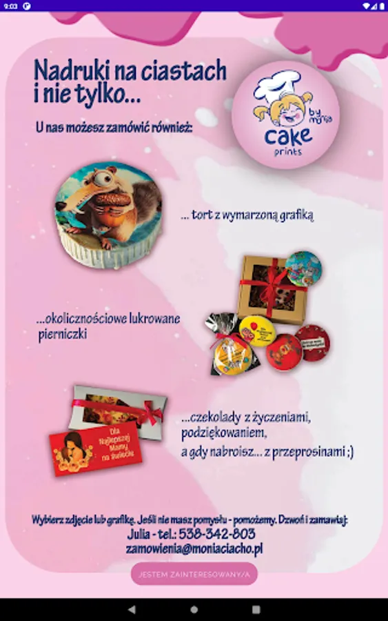 Cake Prints by Monia is the best way to order cakes, cakes and other confectionery products with an individual print for special occasions. Thanks to our application, you can easily and quickly order your favorite cakes from our pastry shop with any printed motif, photo or inscription. We have a wide selection of flavors and shapes, and we also offer the ability to customize the print to your needs. Whether the occasion is a birthday, wedding or other important event, ordering a cake with our app is simple and reliable. Book your favorite cake today and enjoy an unforgettable taste for a special occasion.