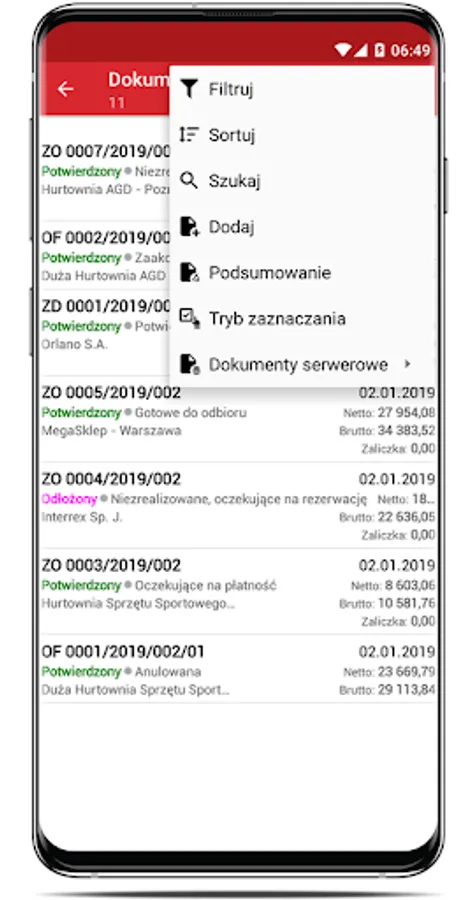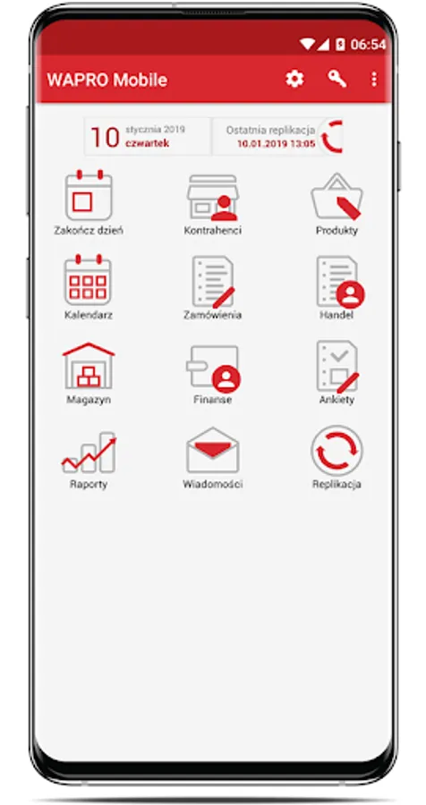 The mobile application is available for smartphone or tablet devices equipped with the Android system. Downloadable application from play.google store includes a demo database. It is possible to change the application into the full activity mode enabling data replication - the database is fed from the WAPRO ERP central system. To work in full activation, the WAPRO Mag Biznes and WAPRO Mobile Management Console programs are required.