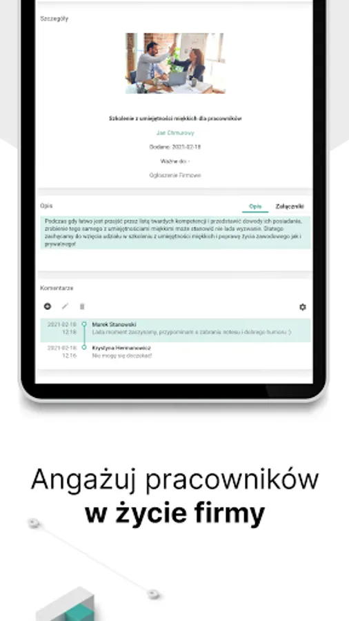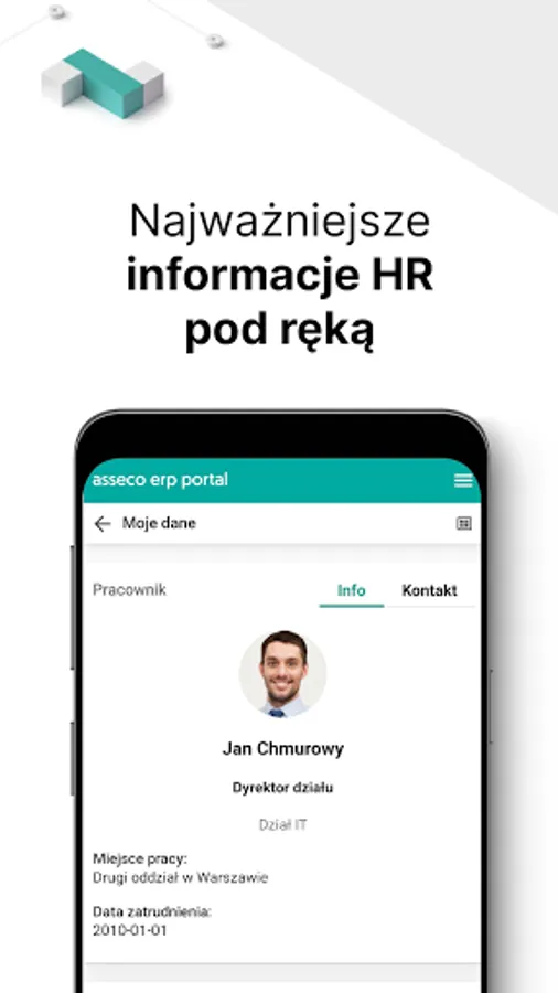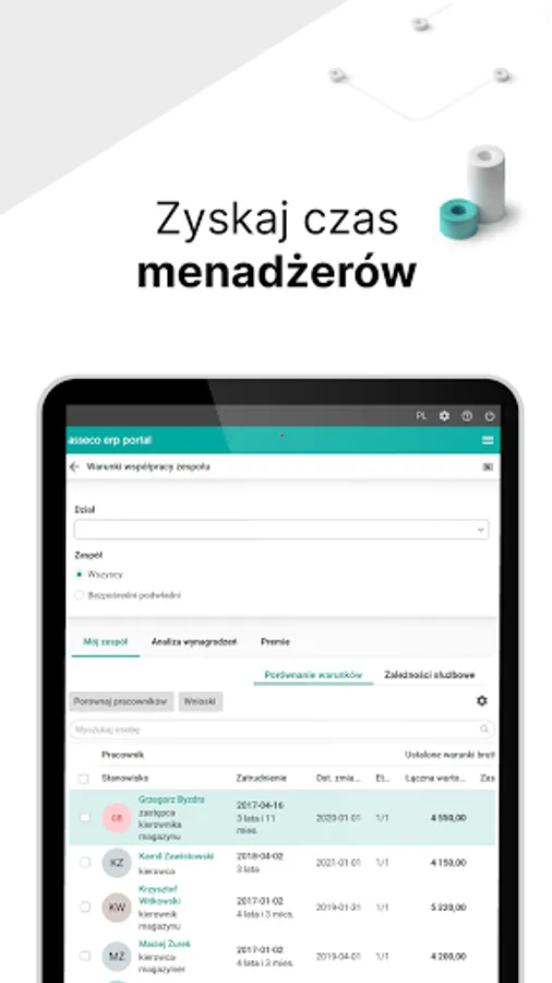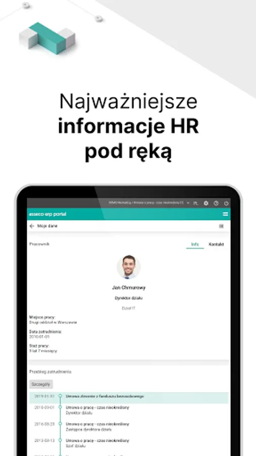 The HR portal is a tool dedicated to both employees and managers who have independent, safe access to it from any place and device (computer, smartphone, tablet). Thanks to the portal, both the employee and his supervisor can handle many HR matters on their own - this way, some of the resources of the HR department are freed. The processes are simplified and standardized and the managerial staff receives a management support tool. The employee portal is a tool that improves not only communication between the HR department and an employee or manager, but also between the employee and the entire organization.