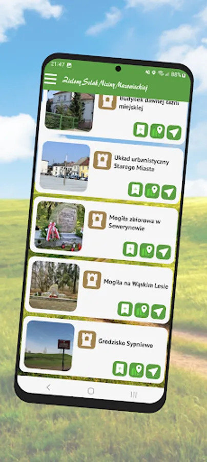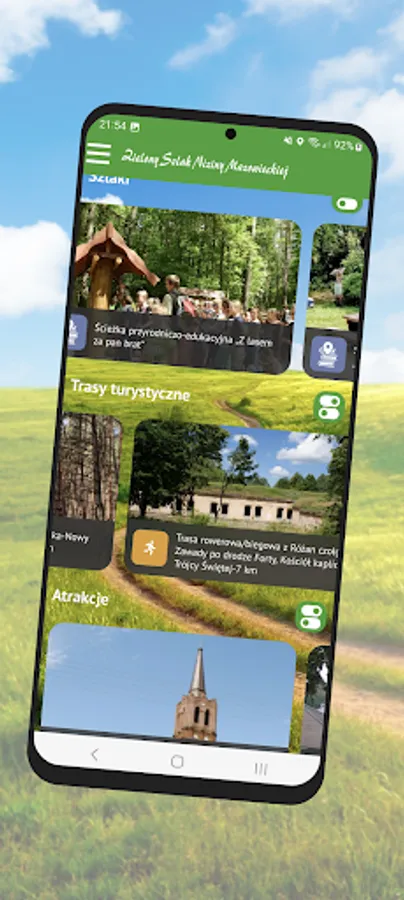 A mobile application that guides us along the green trails of the Masovian Lowland. In the application you will find interesting information on tourism, natural resources and historical and cultural heritage. Tourist must-have for an expedition!