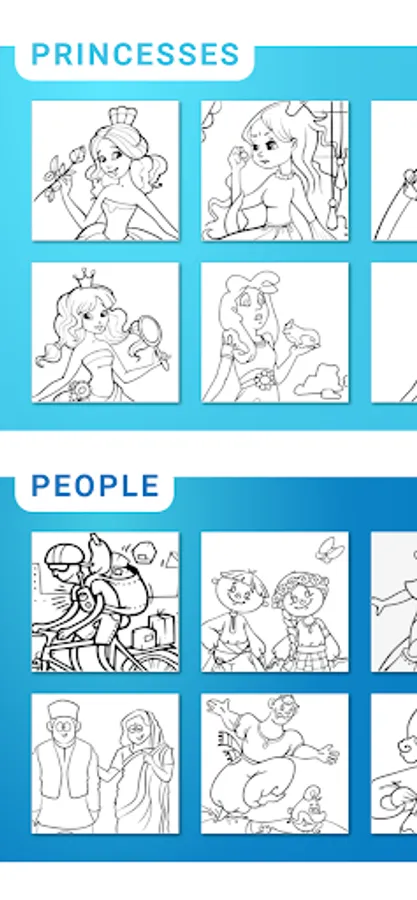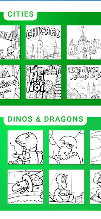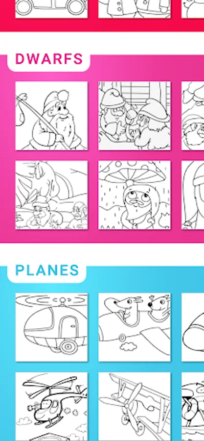 • 400+ coloring pages, with cute pictures organized into the following categories: Animals, Cars, Cities, Detailed, Dinos & Dragons, Dwarfs, Love, People, Nature, Planes, Princesses, Sumer, UFO, Winter, Winter Sports and Stained Glass