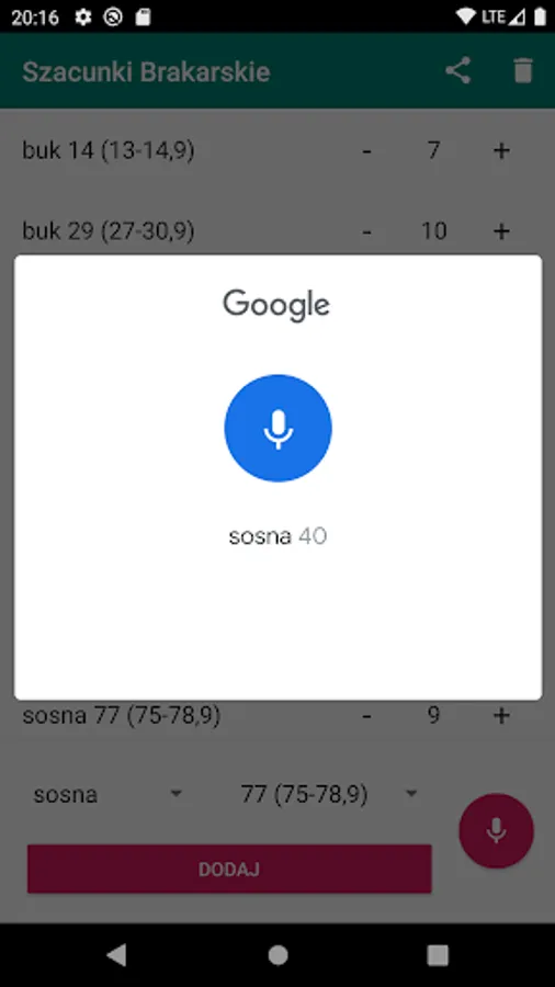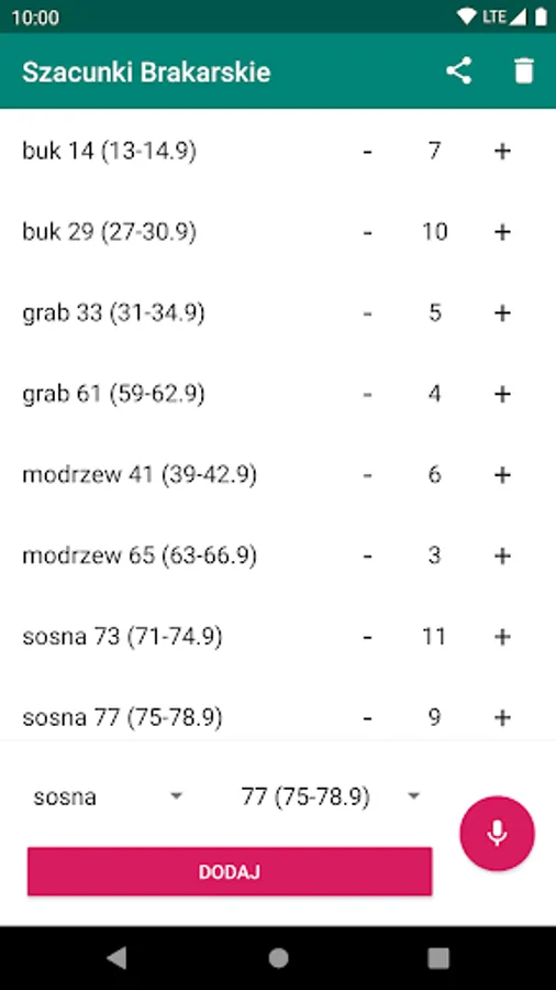 The application allows you to add trees of different species and of different diameters (also using a microphone), and then export to a CSV file that can be easily imported into Excel, OpenOffice or Google Sheets.