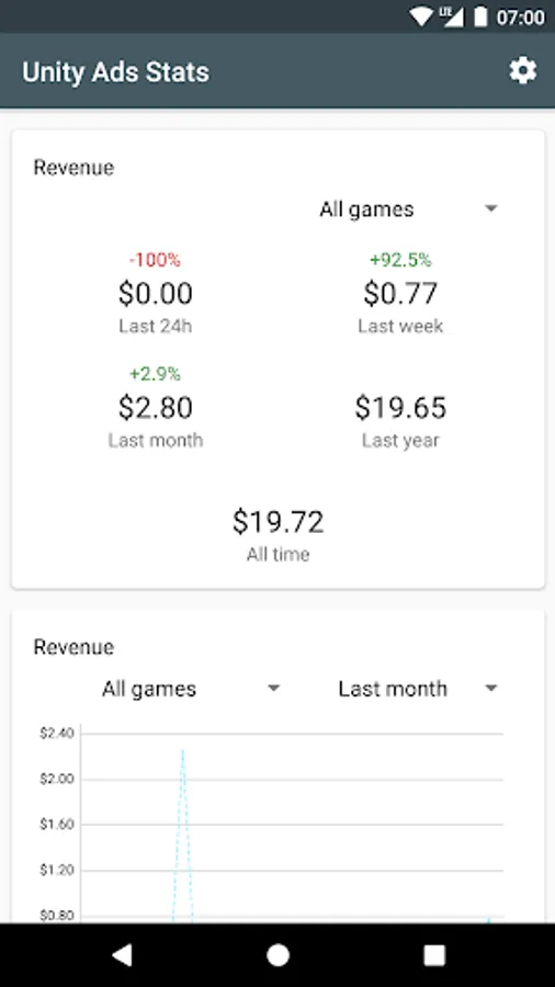 The app doesn't require any logins or passwords - just the the API key from your Unity Ads Dashboard. It works offline, letting you analyse your revenue even if you don't have an Internet connection.