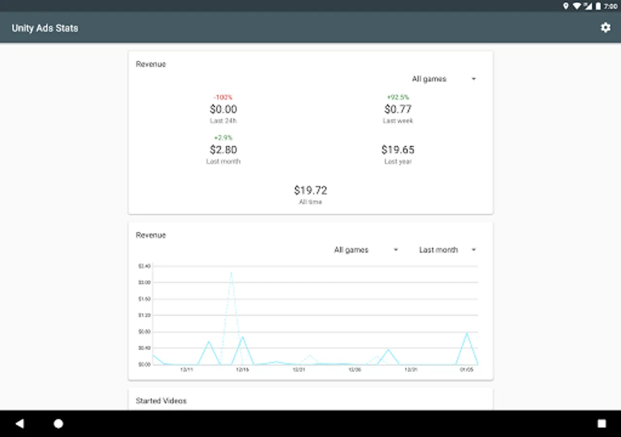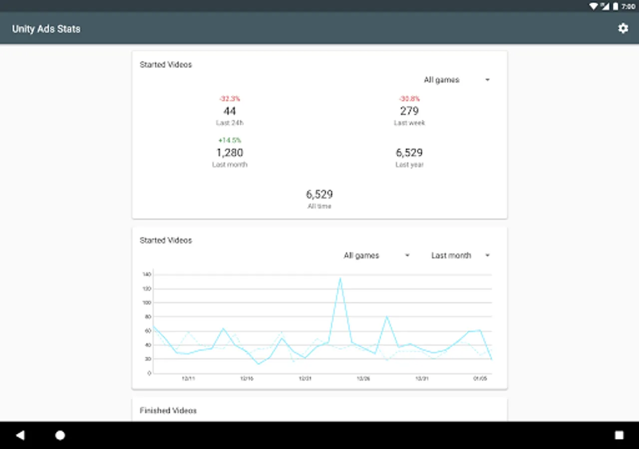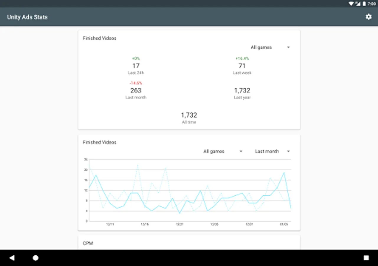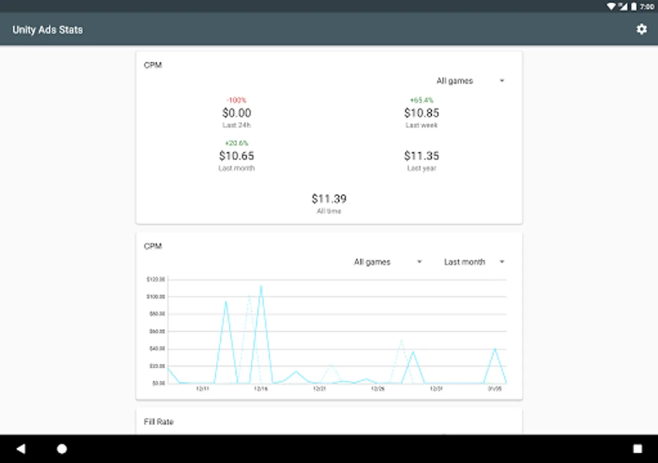 If your games use Unity Ads and you want to stay up to date with their performance, this app is just for you. It lets you see your revenue, started videos, finished videos, CPM and fill rate. It shows detailed charts of all the stats.