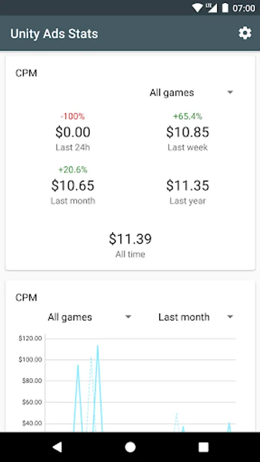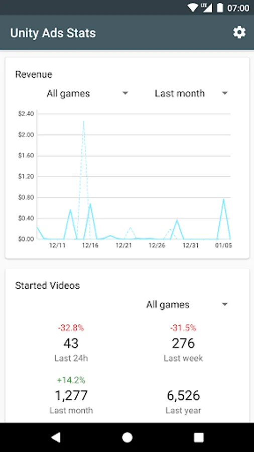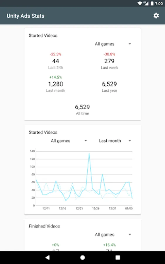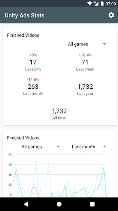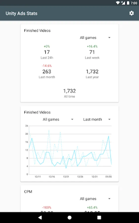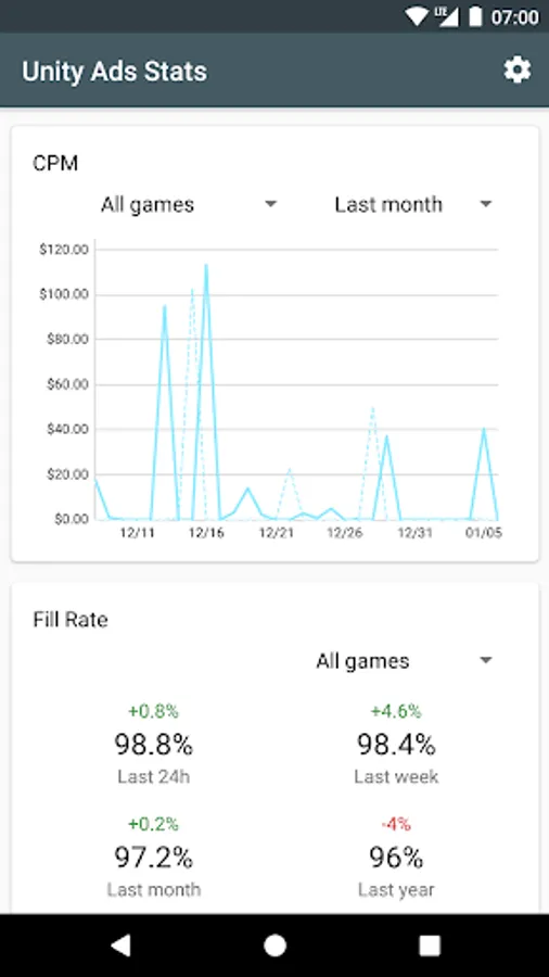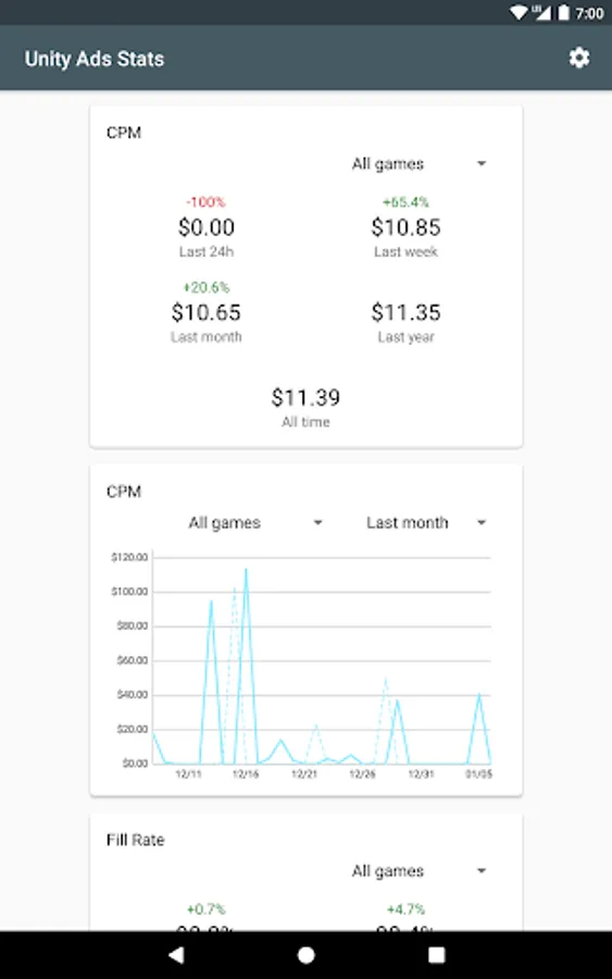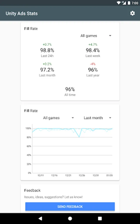 If your games use Unity Ads and you want to stay up to date with their performance, this app is just for you. It lets you see your revenue, started videos, finished videos, CPM and fill rate. It shows detailed charts of all the stats.