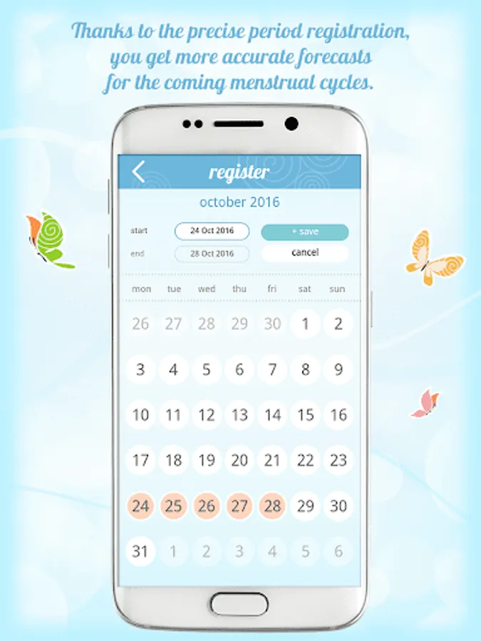 You can choose the way in which the application predicts your periods. You can choose between the two following options: the mean values registered during previous cycles calculated on the basis of archived data from the application or the constant values, in which the cycle’s and period’s duration are defined by yourself.