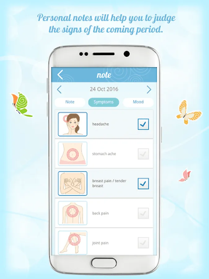 You will be able to describe every day of your cycle by using your own notes and registering symptoms (e.g. heavy bleeding, stomach pain, headache) and moods (e.g. happy, sad, and sleepy).