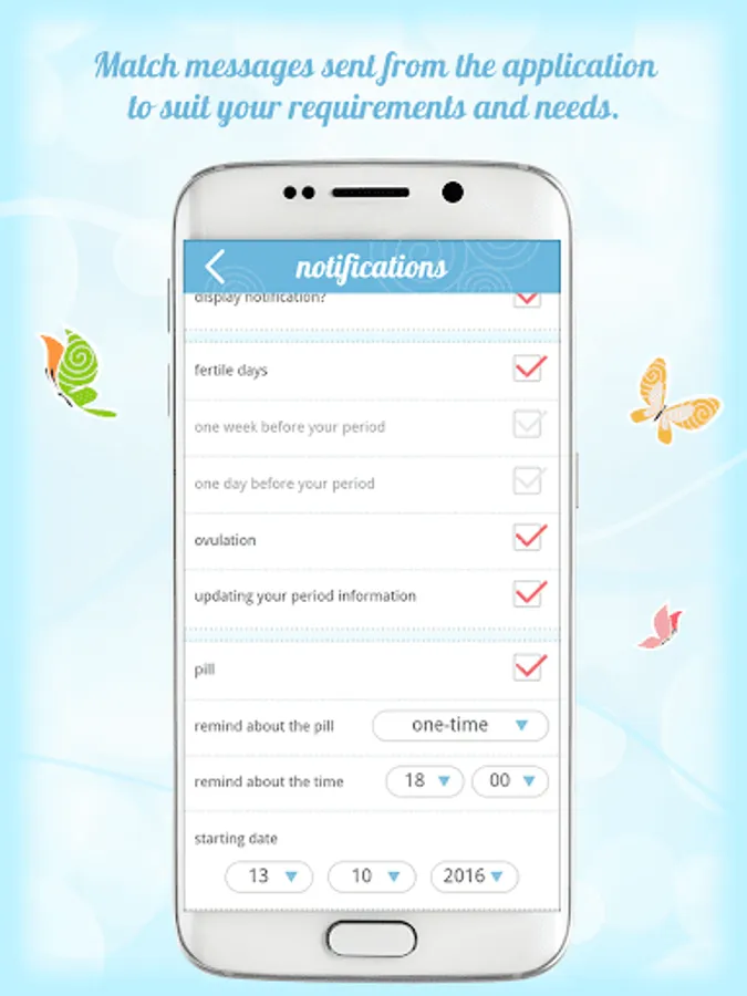 This is thanks to the notification option which can be personalized and adjusted to your needs. Thanks to the notifications you will know when your fertile days, period or ovulation approach. You can also set a notification reminding you to take your pill.