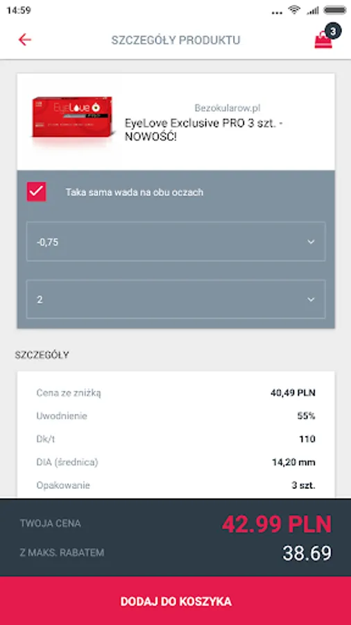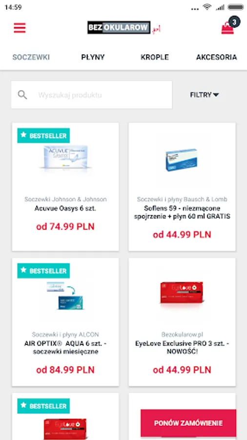 Bezokularow.pl is an online shop involved in the sale of contact lenses for more than 10 years. Following the needs of customers - users of contact lenses, the store offers another form of purchases of fluid lenses and care - through a mobile application available on Android phones. The offer will find the most popular brands of contact lenses such as, among others, ACUVUE OASYS, Air Optix, DAILIES Total1, Dailies AquaComfort PLUS, Biofinity, Pure Vision Soflens 59 Soflens 38, EyeLove Exclusive PRO or EyeLove Exclusive 1-Day. In the application store Bezokularow.pl not run out of well-known manufacturers such as Johnson & Johnson Alcon (formerly Ciba Vision), Cooper Vision, Bausch & Lomb, Horien, Zeiss or Eyeye. Regardless of whether you have astigmatism, presbyopia and myopia or hyperopia can - you can find and buy your contact lenses and cleaning solutions.