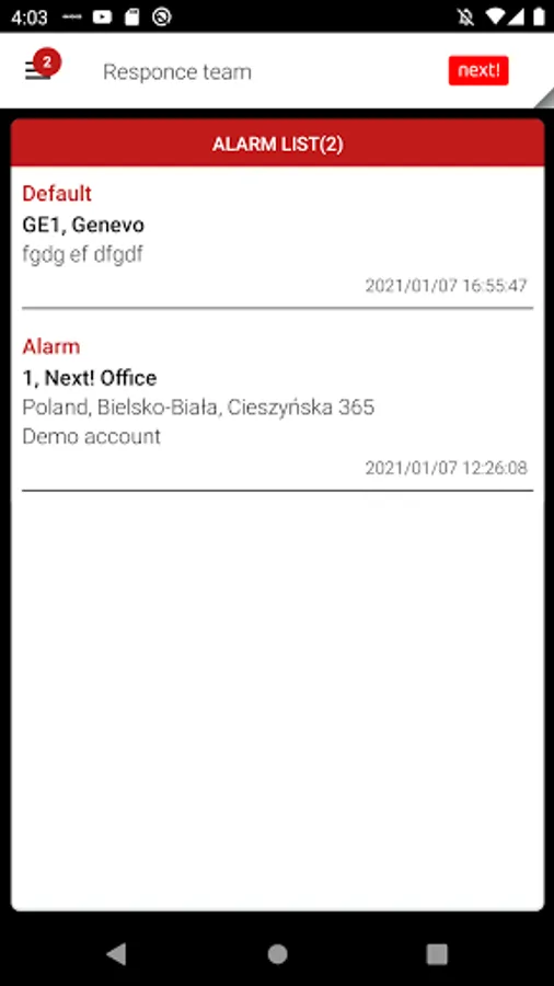 • preview of the list of alarms and control access ramps for facilities along with their address and time to complete the notification,