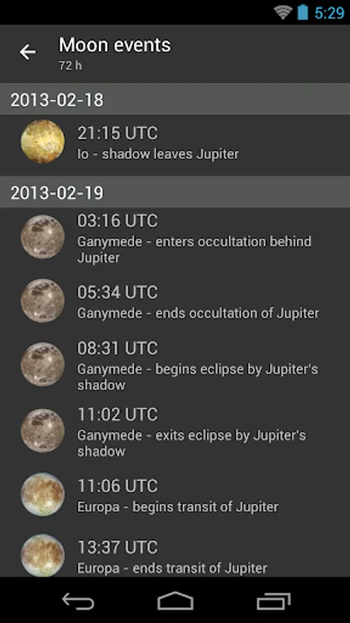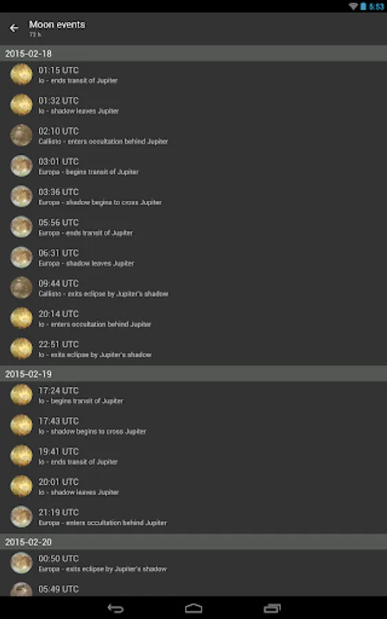 -Calculate moon events i.e. occultation, eclipse by Jupiter's shadow, as well as moon and shadow transits.