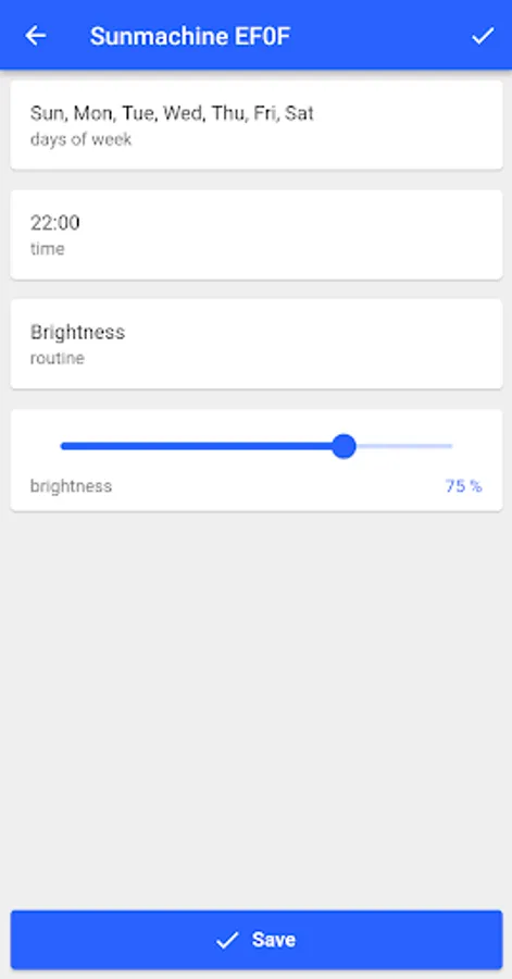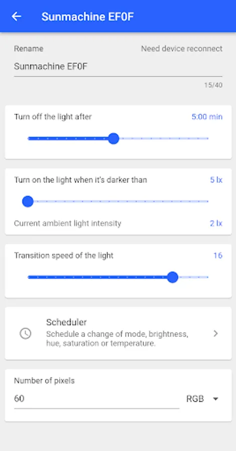 - Built-in scheduler that allows to change mode, brightness, hue, saturation or temperature at a specific time.