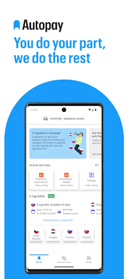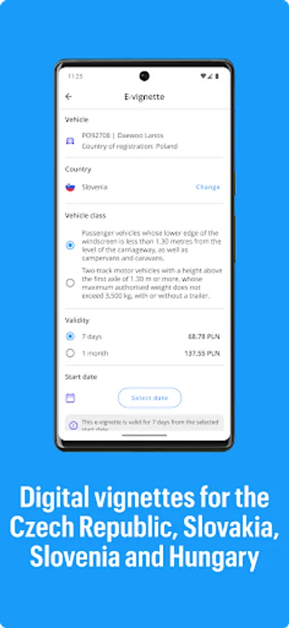 Autopay allows you to buy e-vignettes to the Czech Republic, Slovakia, Slovenia and Hungary. All you have to do is log in to your account, select the country you are interested in, indicate the number of days and confirm the payment. The e-vignette will be sent to your mailbox (in the form of a .pdf file). You don't even need to print it. All you have to do is show it on the screen of your phone during a possible inspection.