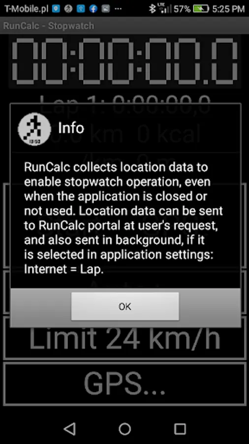 RunCalc collects location data to enable stopwatch operation, even when the application is closed or not used. Location data can be sent to RunCalc portal at user's request, and also sent in background, if it is selected in application settings: Internet = Lap.