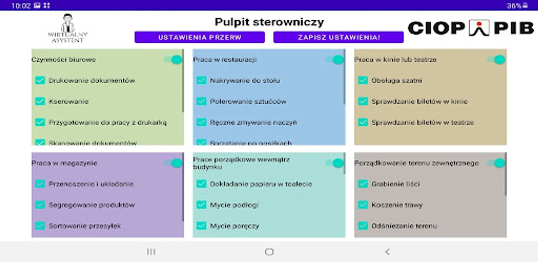 The “Supervisor/Trainer” profile allows you to arrange activities according to your preferences. It allows you to choose professional tasks that the employee performs and in which he or she should be supported on a given day. After enabling the profile, a control panel appears with a list of all groups of activities and professional tasks. Green marking next to groups or tasks means that they are active - available in the application and can be performed. Unchecking them deactivates them. The supervisor/trainer also has the ability to set the employee's working time to be able to remind him about breaks. After a set time, an information about the need to take a break, accompanied by a sound signal, will appear on the desktop of an employee with intellectual disabilities. If we do not want the information about the break to appear on the employee's desktop, then, as in the case of tasks, we can deactivate it by unchecking it in the control panel. Remember to save your settings every time.