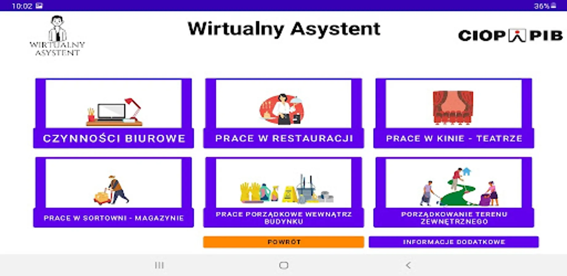 The Virtual Assistant application is designed to support people with intellectual disabilities in their work. This tool easily shows you step by step how to perform selected professional tasks. The description of the task is supported by a photo showing the given activity and a sound file.