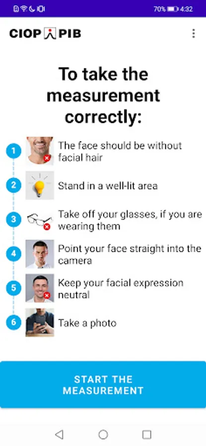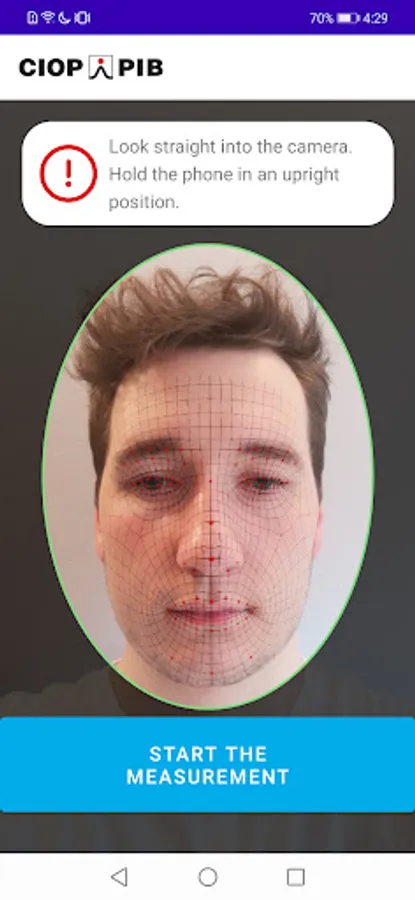 To perform the measurement, it is necessary to accept the terms of use. After accepting them, you can start measuring the face.