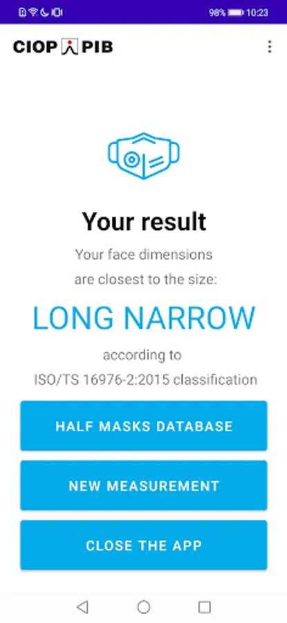 Based on the measurements performed, the application assigns the size of the user's face to one of five sizes described as: small, short-wide, medium, long-narrow and large. These sizes are defined in ISO / TS 16976-2: 2015 and ISO 16900-5: 2016.