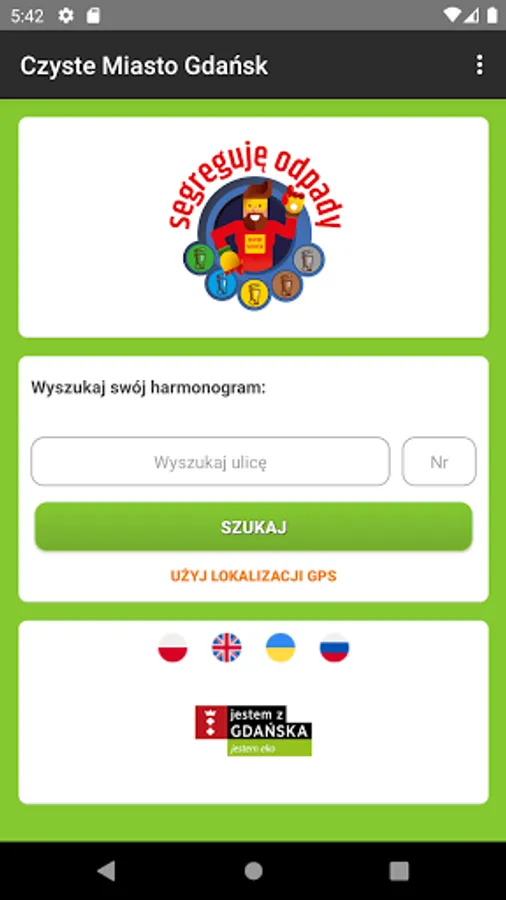 The application will download the schedule for your address of residence from the city of Gdańsk, so you do not have to search for your schedule in pdf files or the paper version.