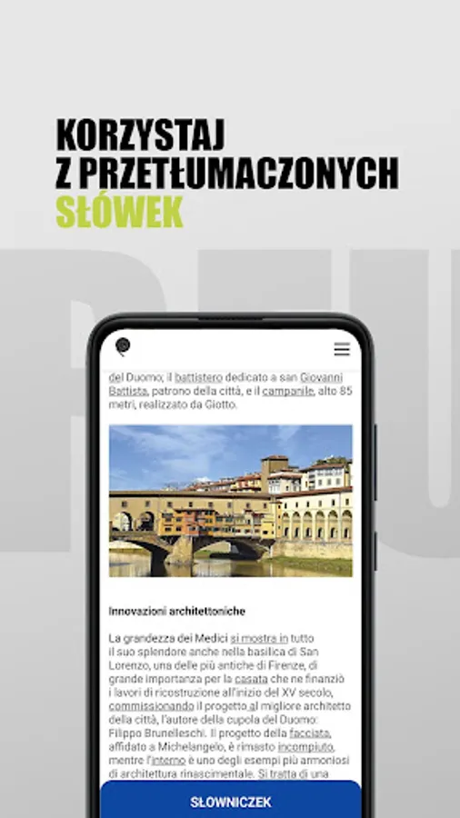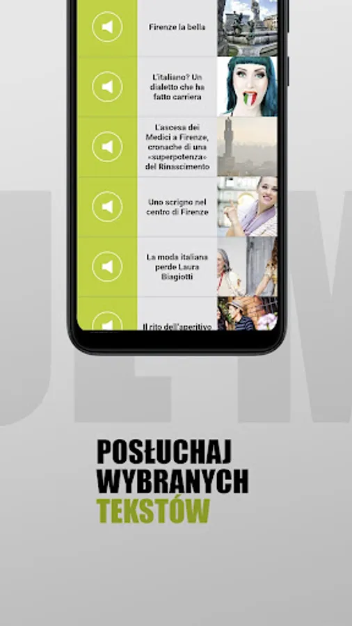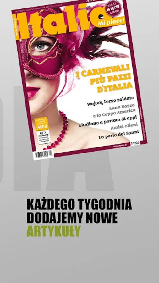 Italia Mi piace application! is a great tool to improve your Italian language skills. We provide dozens of articles on a wide range of topics. Each of them is enriched with a dictionary with translations of the most difficult vocabulary. Every week we add new texts.