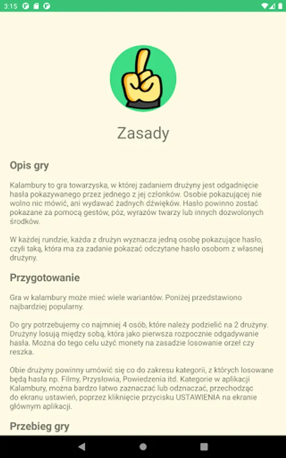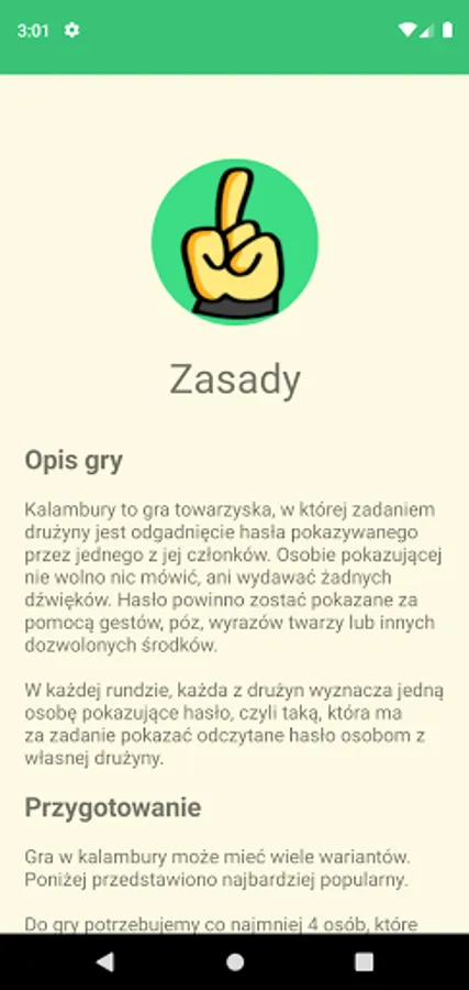 Puns is a party game in which the task of the team is to guess the password displayed by one of its members. The person showing is not allowed to say anything or make any sounds. The password should be displayed using gestures, poses, facial expressions, or any other permitted means.