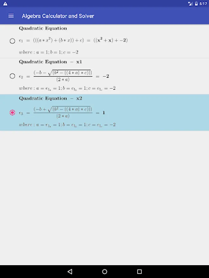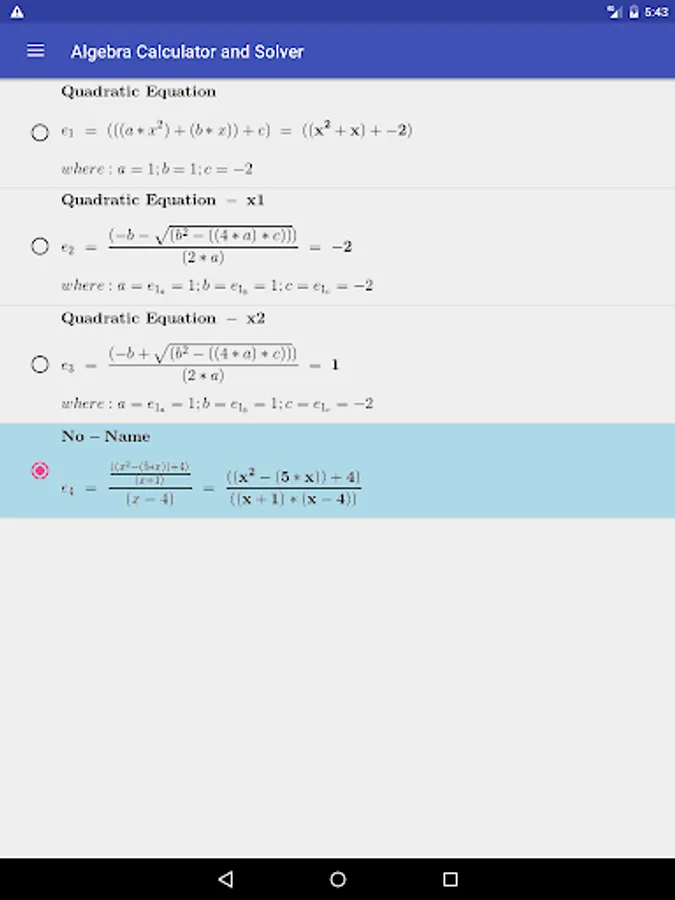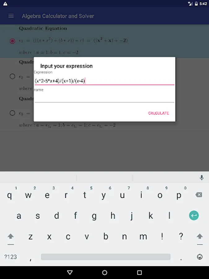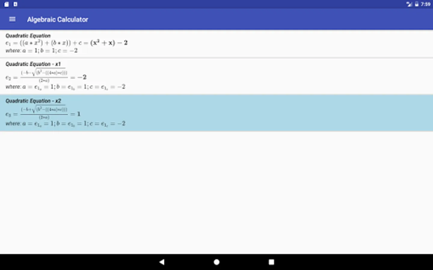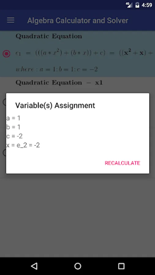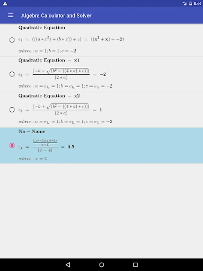 The application acts as an Arithmetic calculator for expressions with all variables bounded or as an Algebra solver when formulas come with free variables. At any time free variables can be bounded and the expression(s) re-calculated. It is possible to define a list of expressions. Each expression is assigned the unique name, which can later be referenced in other expression(s).