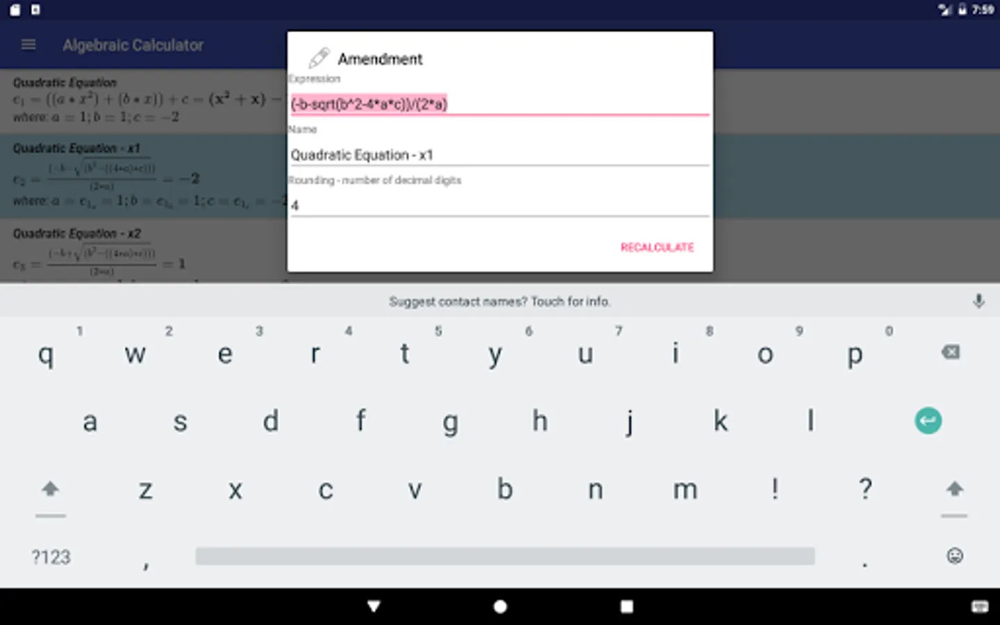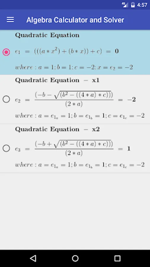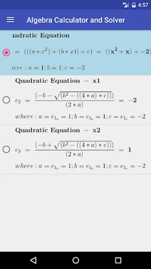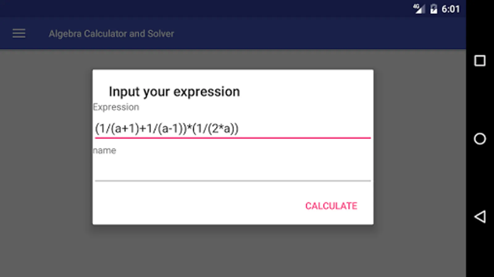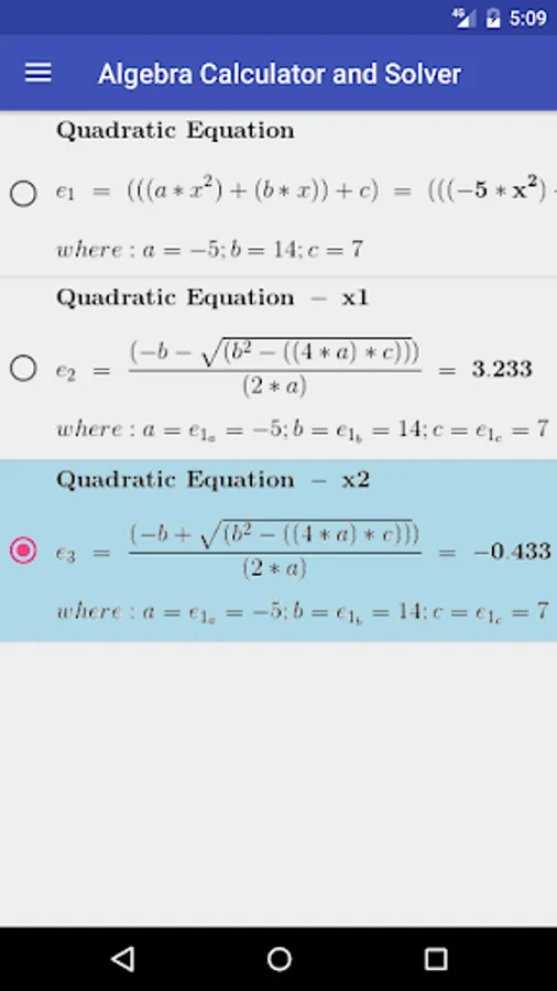 The application acts as an Arithmetic calculator for expressions with all variables bounded or as an Algebra solver when formulas come with free variables. At any time free variables can be bounded and the expression(s) re-calculated. It is possible to define a list of expressions. Each expression is assigned the unique name, which can later be referenced in other expression(s).