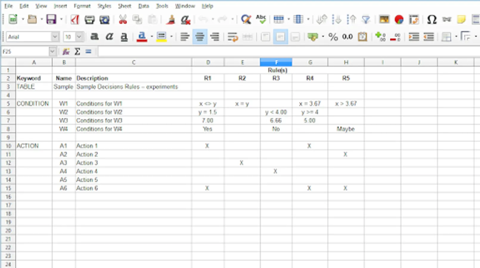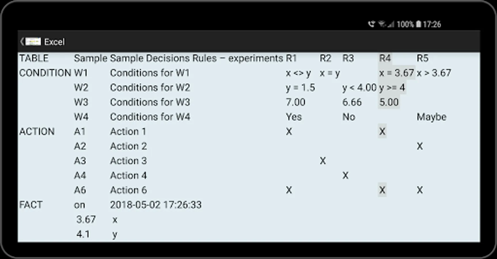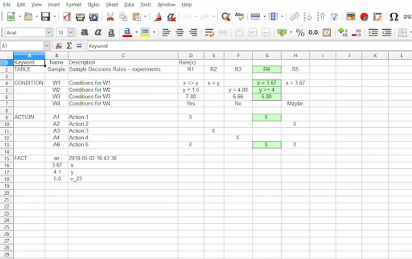 Decision Tables (in form of excel spreadsheets) tell us which Actions are allowed and under which Conditions. Decision Tables one can understand as Knowledge. Prolog, an AI Language, is used as an Inference Engine.