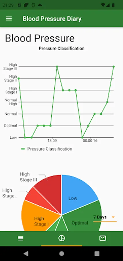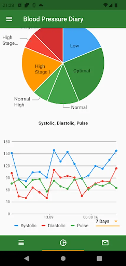 Using application Blood Pressure Diary (BPD) you can record, browse, create charts and report measurements of your blood pressure and pulse. Application BPD classifies measure of blood pressure using Standard or Modern method of classification.