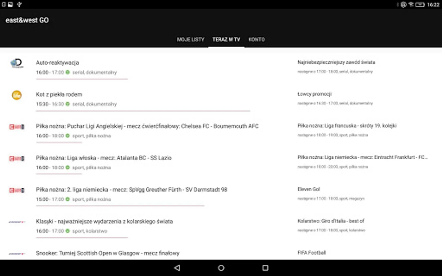 The mobile application enables subscribers East & West watch on your smartphone or tablet selected live TV channels. The new service GO east & west & east westuzyskują customers access to selected channels. The current list of available TV channels can be found at www.eastwest.com.pl