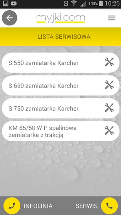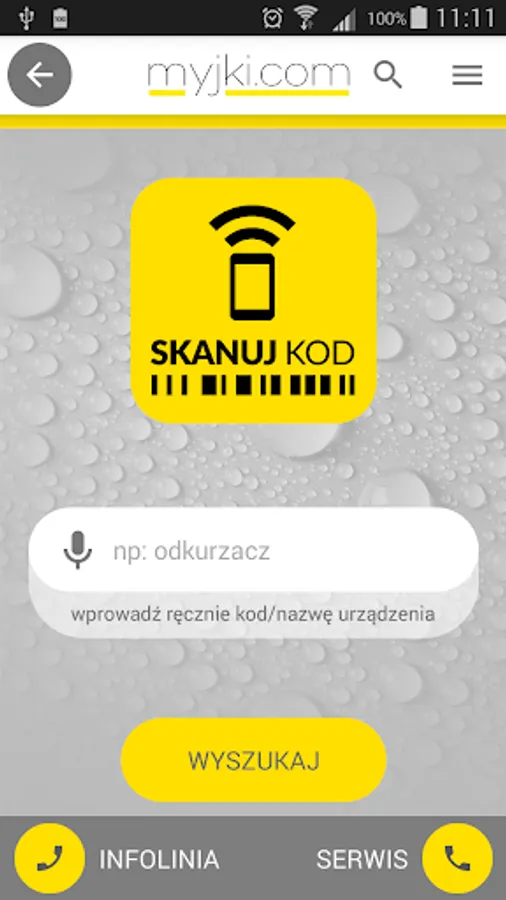 Searching products in application tab / search / is performed by scanning a barcode, voice search or manual typing. Kärcher if the device is damaged, an easy way to contact the service by telephone, or by making a request for repair by a bookmark / service /.
