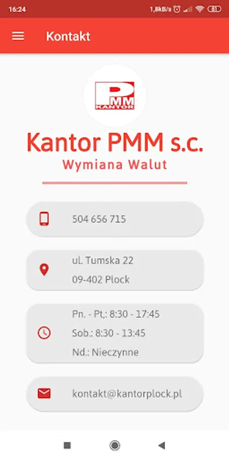 In the application you can quickly check or negotiate exchange rates, contact the staff - both by phone and e-mail, and you can easily find us thanks to maps and navigation. You will also get up-to-date information on banknotes in circulation (including photos).