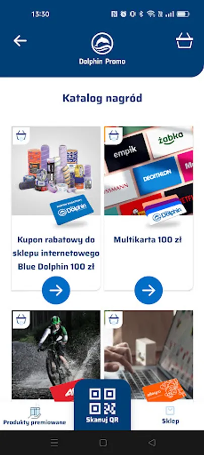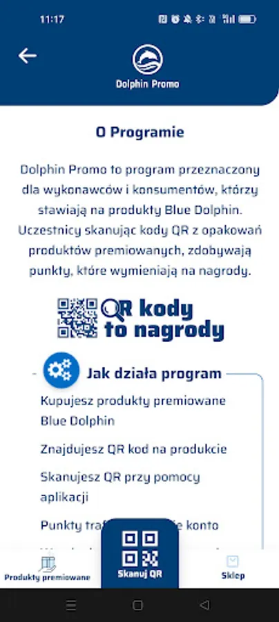 The Dolphin Promo application will give you access to the loyalty program QR CODES ARE REWARDS. As a program participant, you will scan QR codes visible on selected Blue Dolphin products, which will directly translate into points earned. These, in turn, can be exchanged for attractive prizes by ordering them in a simple way. In addition, the Dolphin Promo application offers you a number of additionally scored challenges, and also allows you to check your status in the program and constant access to news and information from Blue Dolphin