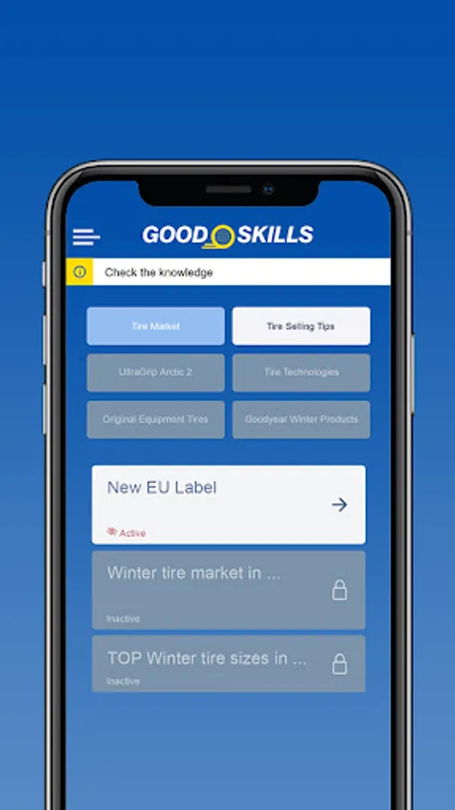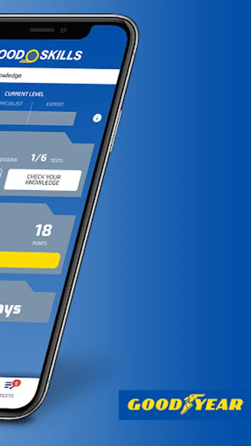 GOOD SKILLS is a mobile application of a training exclusively for companies cooperating with Goodyear. The goal of the training is to share relevant market and tire knowledge with employees of companies partnering with Goodyear and help them to learn valuable knowledge and skills. We believe that this should help your employees grow and be more efficient in their daily job. GOOD SKILLS is a useful and interesting training. GOOD SKILLS consists of several courses. Each course consists of three Knowledge Sessions and The Final Test. There are three levels in the training. You start at the BEGINNER level, but you definitely want to finish the game at the highest level - EXPERT. Thanks to this you will get the GOODYEAR EXPERT Certificate confirming your unique knowledge. If you want to join Good Skills you need to receive invitation e-mail from Goodyear.