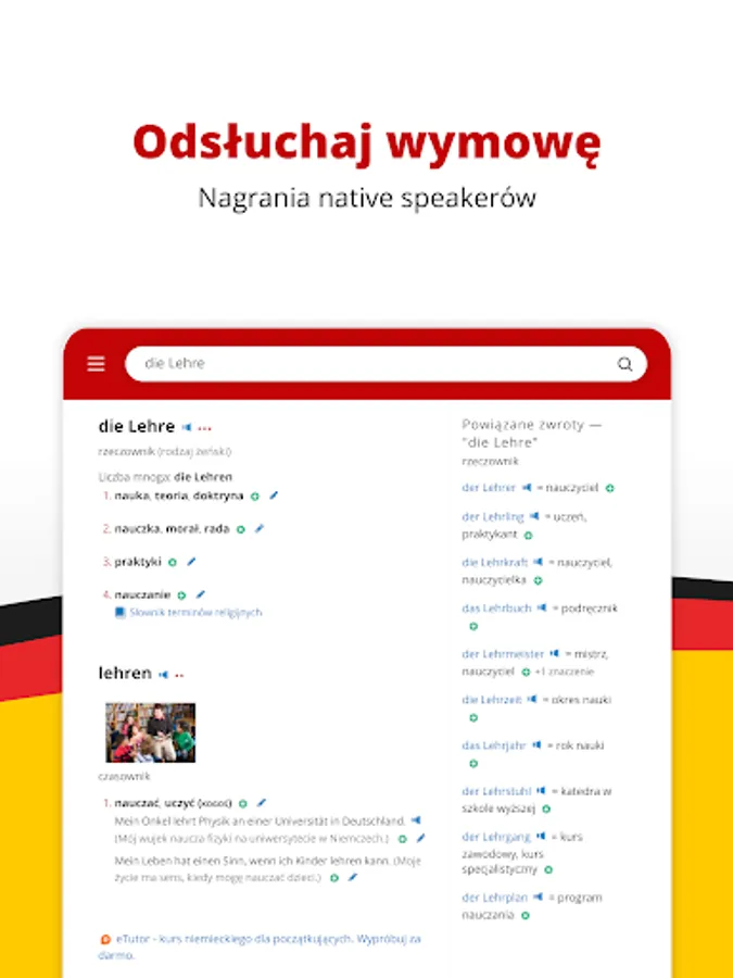 The Diki German Dictionary application requires an internet connection. Thanks to this, you use the constantly updated database of passwords and have access to recordings and pictures illustrating the words.