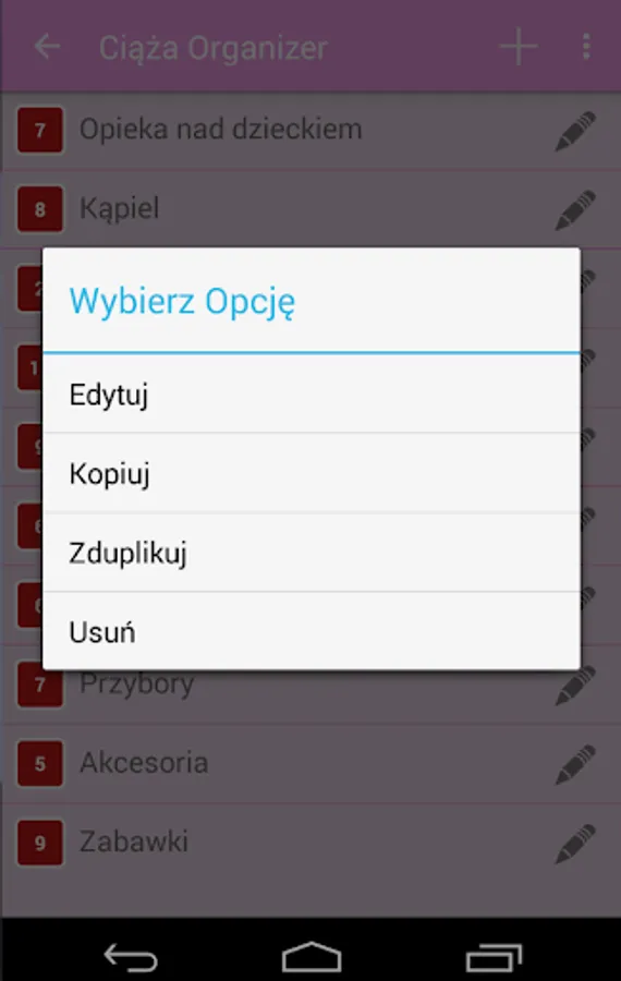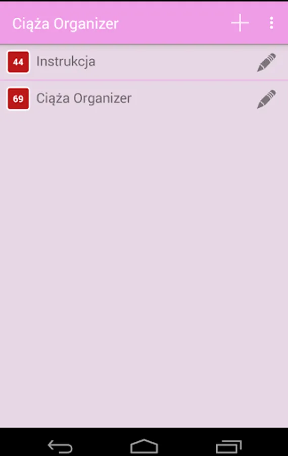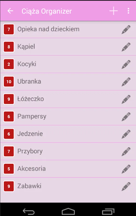 Apka allows you to purchase things for the newborn, while being pregnant, so the task list of categories with the possibility of adding a letter templates.