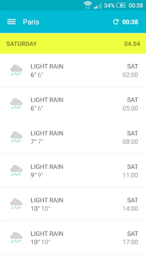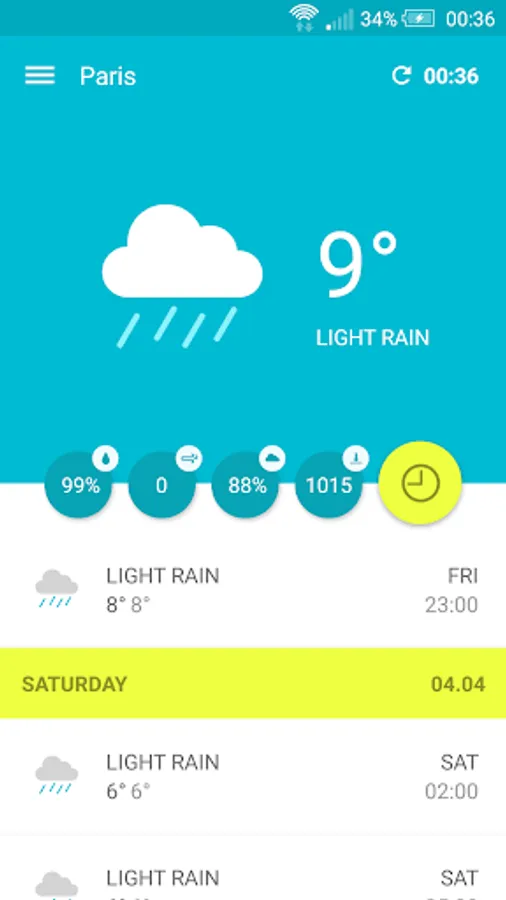 - Information about: min/max temperature, humidity, wind speed, wind direction, cloudiness, precipitation and pressure
