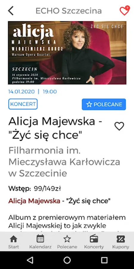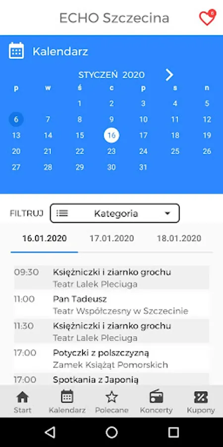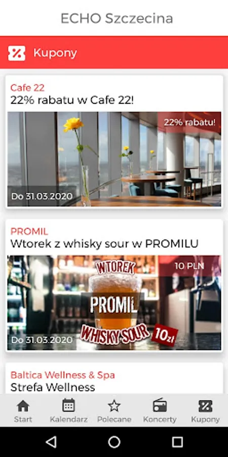 For over 20 years, Echo Szczecina has been providing residents and tourists with information on planned cultural and entertainment events. For the paper version, the echoszczecina.pl portal and the fan page on Fecebook, we give you a mobile free application, thanks to which you will find all information about events planned in Szczecin. In addition, we decided to make the use of the application more attractive by publishing Discount Coupons to many places in Szczecin. See how easy it is. Just show the coupon when placing an order or using the service of the places we recommend.