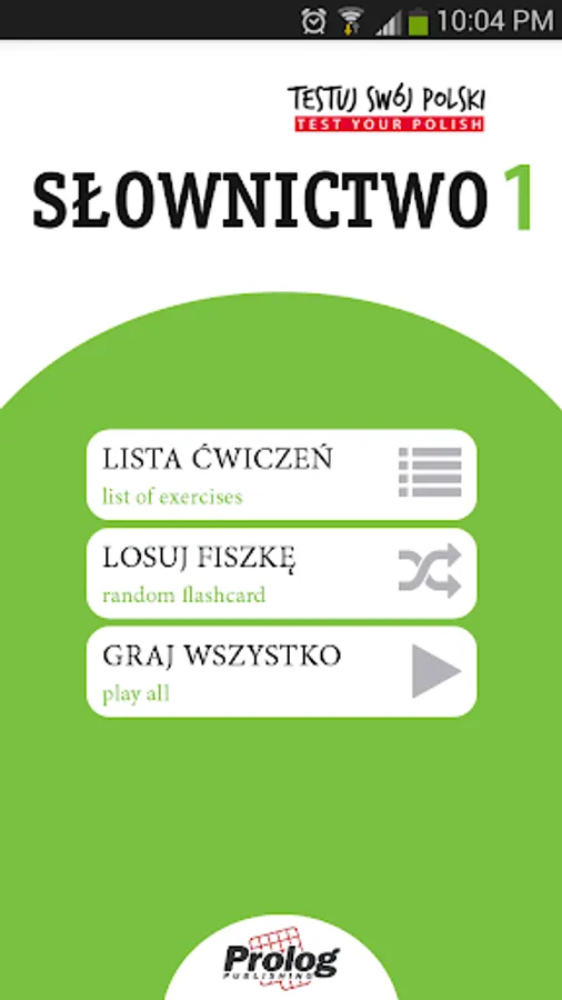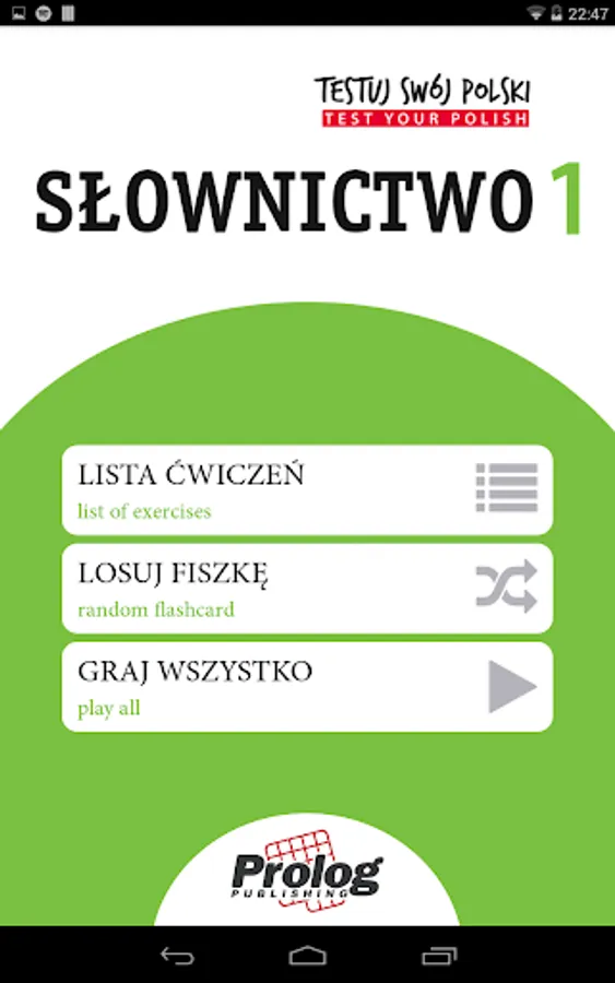 FLASHCARD APPLICATION “Test Your Polish - Vocabulary 1 PLUS" is a part of the “Test Your Polish - Vocabulary 1 PLUS" ("Testuj Swój Polski - Słownictwo 1") PACKAGE (can be obtained at language bookstores or at www.prologpublishing.com)