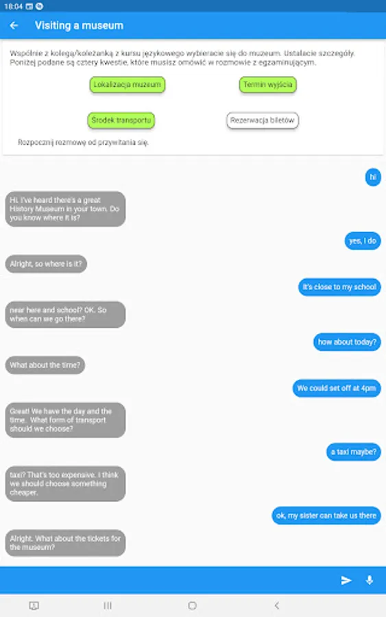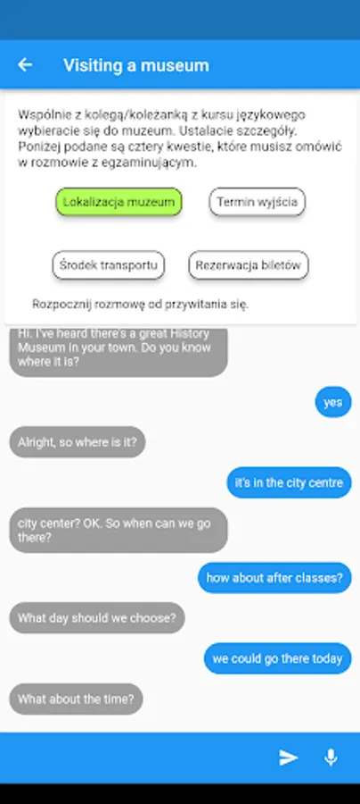 The "Conversation with role play" module has the form of a voicebot using natural language processing and understanding technology (NLP and NLU). Thanks to this, it allows you to practice graduation dialogues without a second interlocutor. In addition, in the final exam instructions included in the task, the application signals feedback which parts of the conversation have been completed.