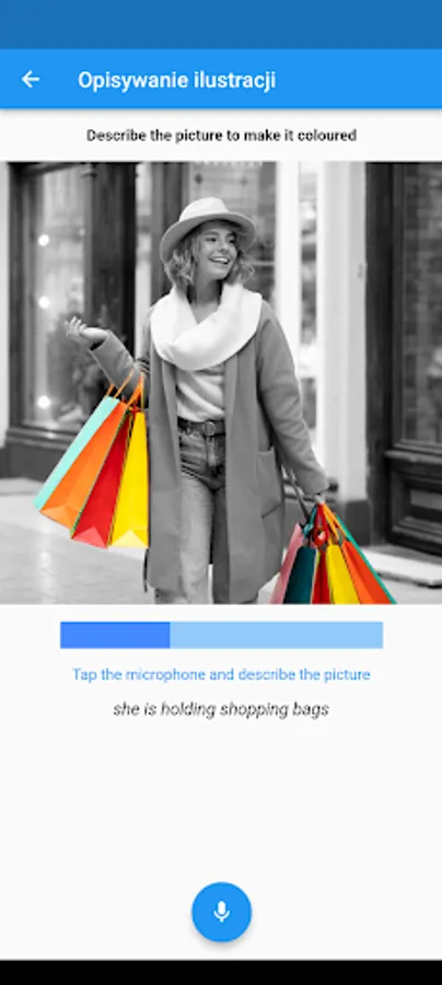 Initially, the displayed photo is black and white, but when describing it, the realized elements of the photo are highlighted in color.